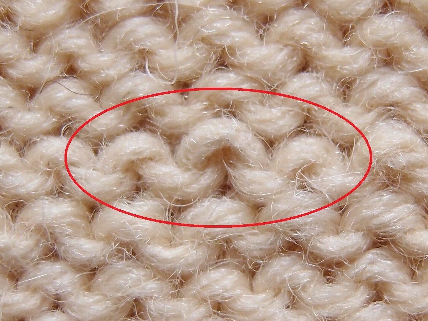 おまけ・・・今回はゲージをとるだけだったので、フェルト化する毛糸のつなぎ方で糸をつないでみました。丸印の部分です。